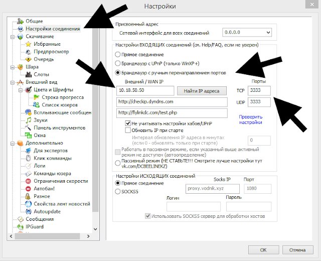 Раздел "Настройка ВХОДЯЩИХ соединений :"
